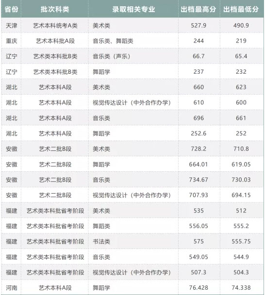 *安徽美術類、舞蹈學、音樂類出檔成績計算方式為:專業成績/專業滿分*700+文化成績/文化滿分*300,其中美術類專業分滿分為375分、舞蹈學專業滿分200分,音樂類專業滿分為210分。