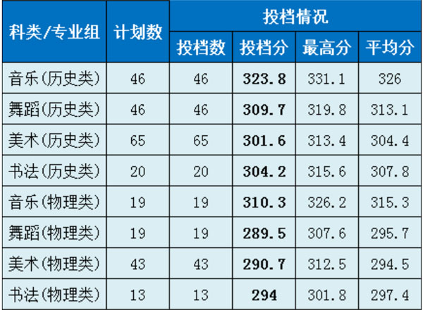 注:藝術類投檔成績為綜合分;計算公式為:綜合分=文化分*30%+專業分*70%