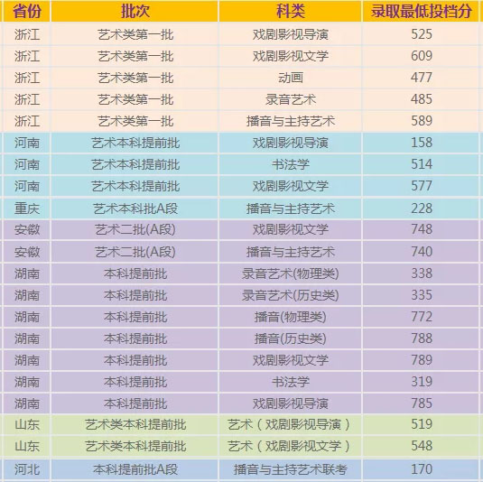 2、戲劇影視導演:考生高考文化課成績達到生源所在省的我校普通類專業(yè)所在批次錄取控制分數(shù)線(廣東、湖南為普通類本科線,云南、河南、四川、陜西為普通類一本線,山東為普通類一段線,浙江為特殊類型招生控制分數(shù)線的80%)前提下,按專業(yè)省統(tǒng)考成績從高到低擇優(yōu)錄取。