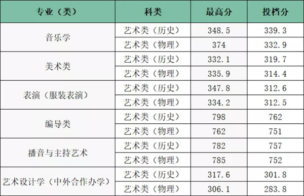 (2)美術類、播音與主持藝術類專業:文化和專業成績達到所在省(區、市)最低錄取控制分數線后,按綜合成績從高到低錄取(綜合成績=統考<聯考>專業分數×60%+高考文化分數×40%)。綜合成績相同時,統考(聯考)專業成績高者優先。