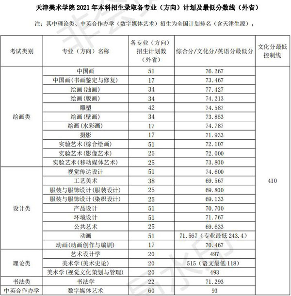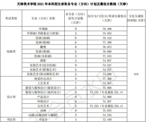 天津美術學院2021年本科招生線下復試專業合格最低控制線