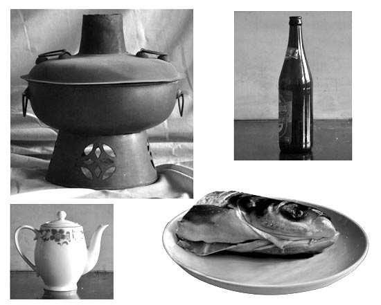 三、模擬寫生內容:一個火鍋,一個茶壺,一個啤酒瓶,一個魚頭,一個瓷盤。