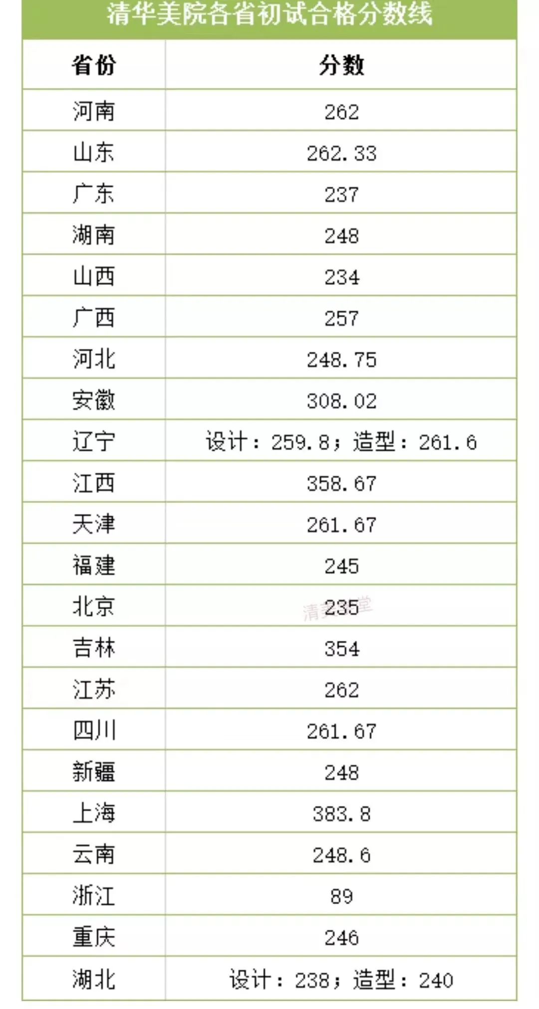 清華大學美術學院2020年部分省份初選合格線: