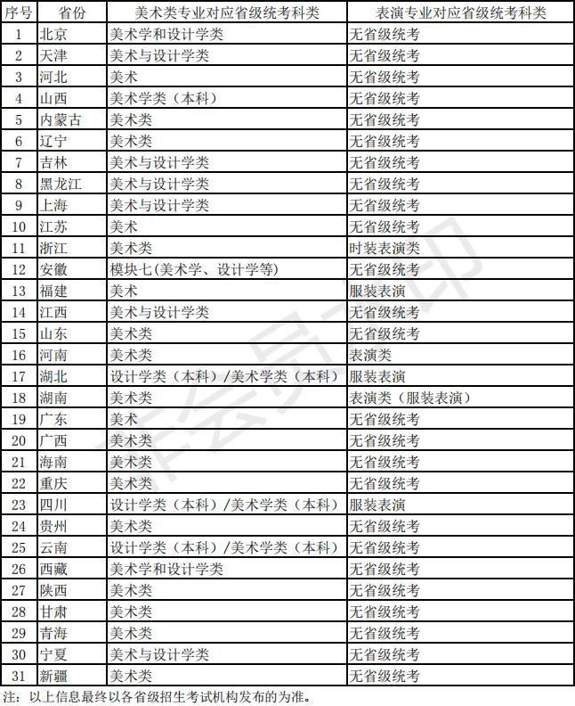 北京服裝學院2022年藝術類本科專業考試省級統考科類對照表