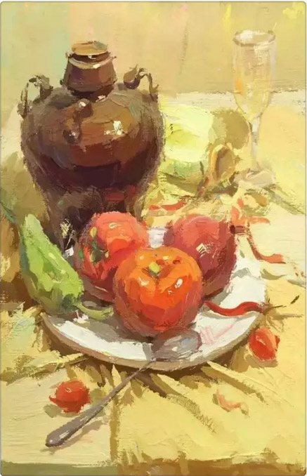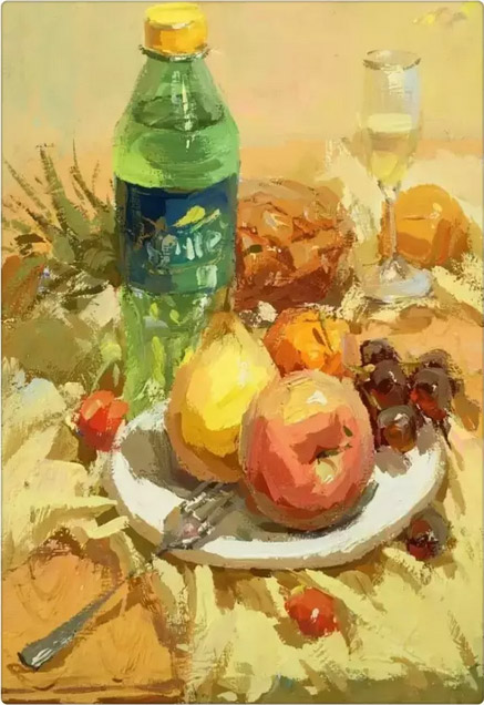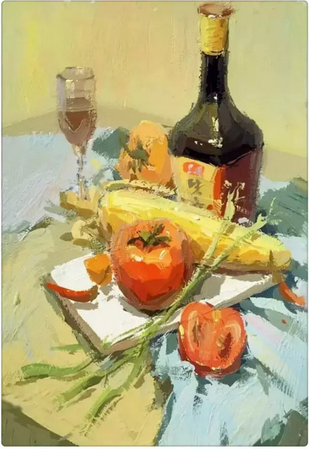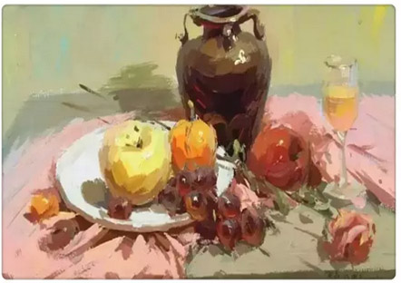 鋪大關(guān)系和刻畫局部的整個繪畫過程都要跟著"結(jié)構(gòu)"^韻律”走。鋪大關(guān)系重點(diǎn)根據(jù)韻律,韻律即畫面的整體色彩基調(diào)和整體形的特征韻味。刻畫局部重點(diǎn)根據(jù)結(jié)構(gòu),結(jié)構(gòu)是物體形狀關(guān)系和體量關(guān)系的核心。