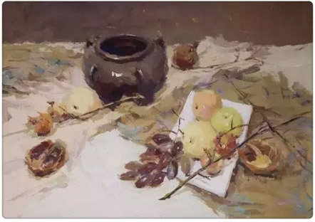 枯筆實(shí)際上是干筆的一種形式,它特別適用于短期作業(yè)主物和襯布的外輪廓線、明暗交界線、結(jié)構(gòu)線、褶皺的表現(xiàn)。枯筆可以遮掩和彌補(bǔ)畫面擺筆疊壓刻畫不夠充分的缺點(diǎn),短短的幾分鐘或十幾分鐘豐富畫面層次。固有色,但幾乎畫面每個色區(qū)都要表現(xiàn)冷暖關(guān)系,冷暖是色彩的獨(dú)特表現(xiàn)手法。
