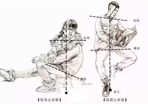 坐姿在整個比例,會因坐平面的高度而產生變化。做的越低則整體比例越短,反之越長。當人物盤腿在地時,整個高度約等于3.5個頭,坐在正常高度時,約等于5.5個頭,坐在比較高處約等于6.5個頭長。