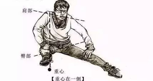人體直立時,人物肩、臀、腿呈平行狀態,此時中心在雙腿之間。