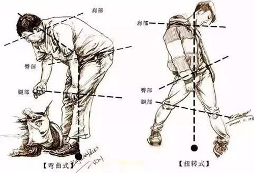 人物整體比例變短,胸腔、盆腔在前側形成夾角,背部彎曲,輪廓明顯。