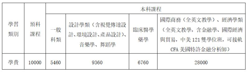 (一) 學費(幣種:人民幣,單位:元/人/學年)