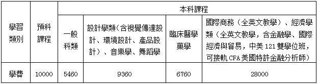 一、學費(幣種:人民幣,單位:元/人/學年)