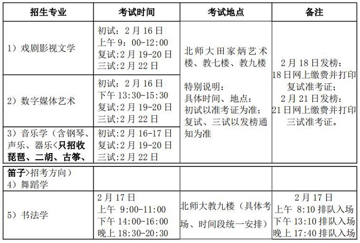 2019年1月18日-2019年2月10日音樂學和舞蹈學專業的考生須登錄網上報名系統自選初試時間段;書法學、戲劇影視文學專業和數字媒體藝術專業統一安排初試時間。