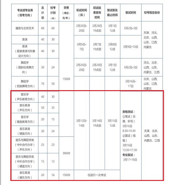 2.音樂學(聲樂教育方向)、音樂表演(聲樂方向)、音樂學(鍵盤教育方向)、音樂表演(鍵盤方向)、音樂表演(器樂方向)、音樂與舞蹈學類(中外合作辦學)(聲樂方向)、音樂與舞蹈學類(中外合作辦學)(鍵盤方向)、舞蹈學(民族舞等方向)、舞蹈學(國際標準舞方向)、表演(服裝表演與形象設計方向)和表演專業的錄取規則:考生高考文化成績達到所在省(區、市)劃定的藝術類本科專業錄取控制分數線,根據考生所在省(區、市)編制的招生計劃,按我校藝術類專業考試成績擇優錄取。