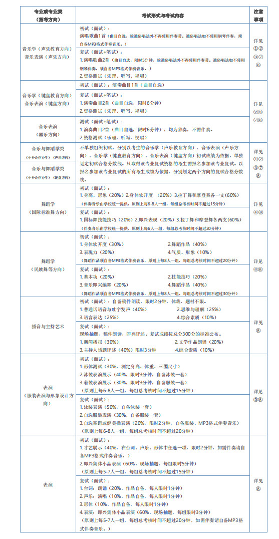 ②音樂學(鍵盤教育方向)、音樂表演(鍵盤方向)專業均只招收鋼琴和手風琴考生。兩個專業統一考試大綱,混編考試,分別劃定合格生源,考生僅能選擇其中一個專業報考,不可兼報。