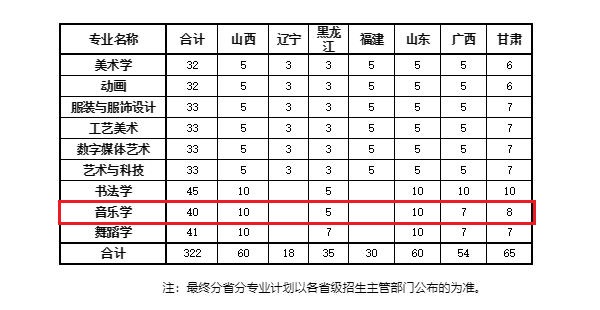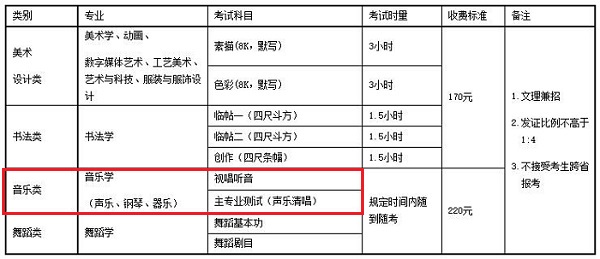 音樂類專業(yè)總分滿分為200分。專業(yè)成績計算方法:各科滿分均為100分,專業(yè)總分=視唱聽音成績×權(quán)重系數(shù)0.4+主專業(yè)成績×權(quán)重系數(shù)1.6。