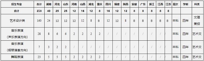 音樂舞蹈類招生計劃總數為58名,只招文科,按照專業招生、專業培養,不能轉換專業。在湖南、河北、山東3省根據專業校考成績招生,在河南、山西、湖北、重慶4省根據省級統考成績招生。