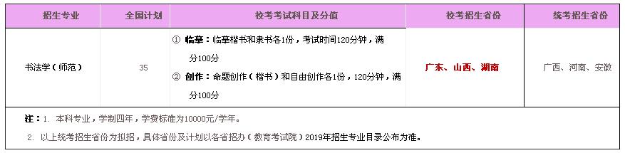 2.報考條件:廣東考點只接受文化高考所在地為廣東省的考生報名,不接受其他省考生報名。按廣東省招生辦要求報考藝術類校考必須是藝術類考生,拒絕普通類考生報考。書法學(師范)專業為廣東省統考未涉及專業,考生不需要參加藝術類術科省統考可直接參加我校組織的藝術類校考。但必須持有《廣東省2019年報考普通高等學校藝術類專業校考準考證》的考生方能報名參加我校組織的校考,否則后果自負。
