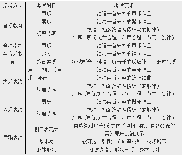 1、音樂(lè)教育、器樂(lè)表演方向:男生1.65米(含)以上,女生1.55米(含)以上;