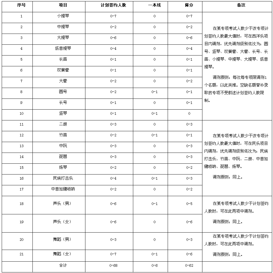 2019年高水平藝術團招生按教育部規定簽約68人,根據藝術專項測試成績排名進行簽約,各專項招生計劃簽約人數具體如下: